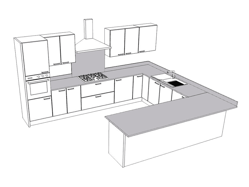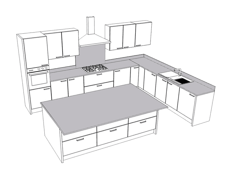 U-Shape Worktop, upstands & wide splashback plus sink & hob cut out. Includes laser template, delivery and installation