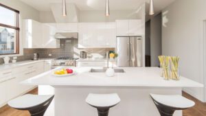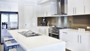 U-Shape Worktop, upstands & wide splashback plus sink & hob cut out. Includes laser template, delivery and installation